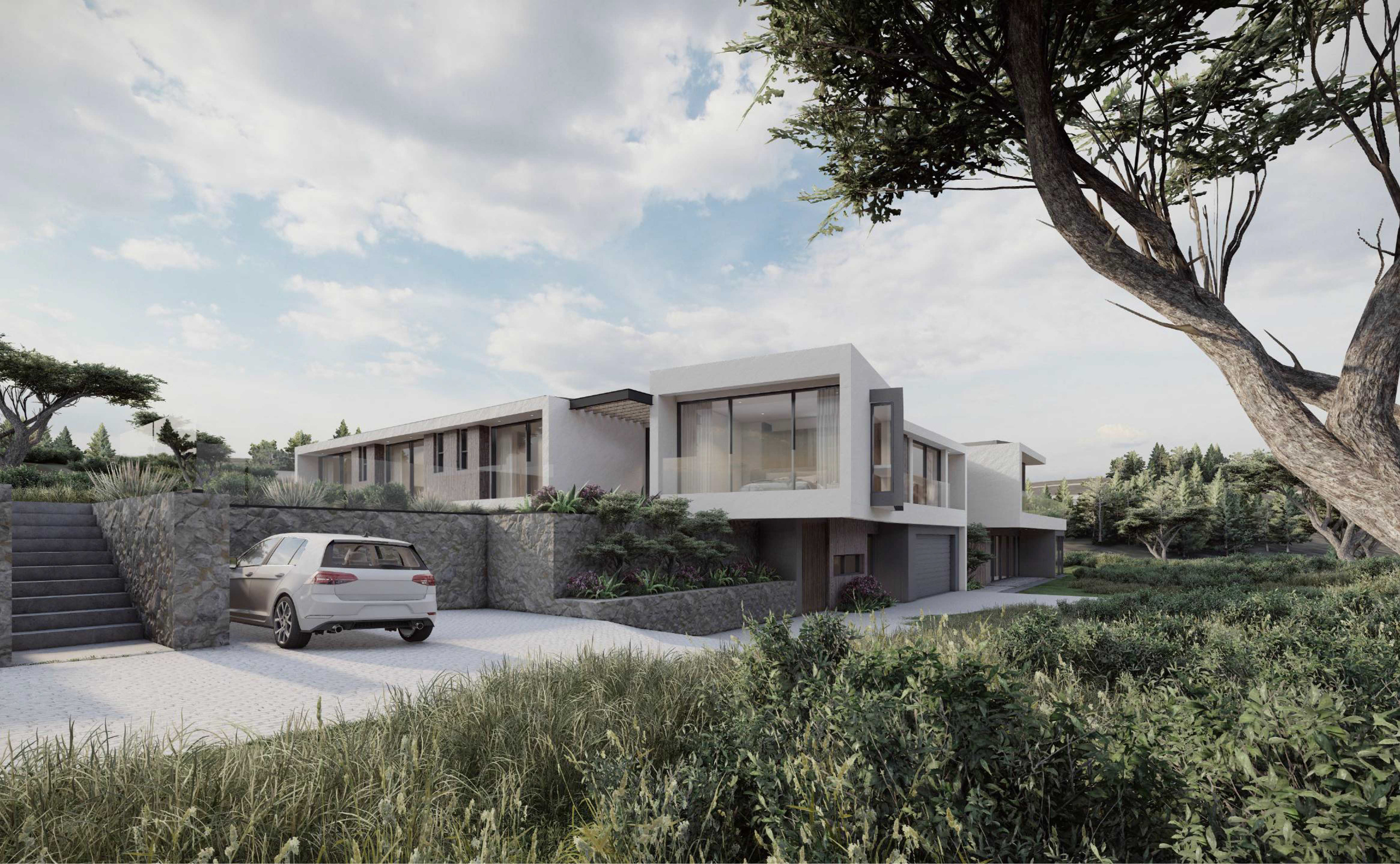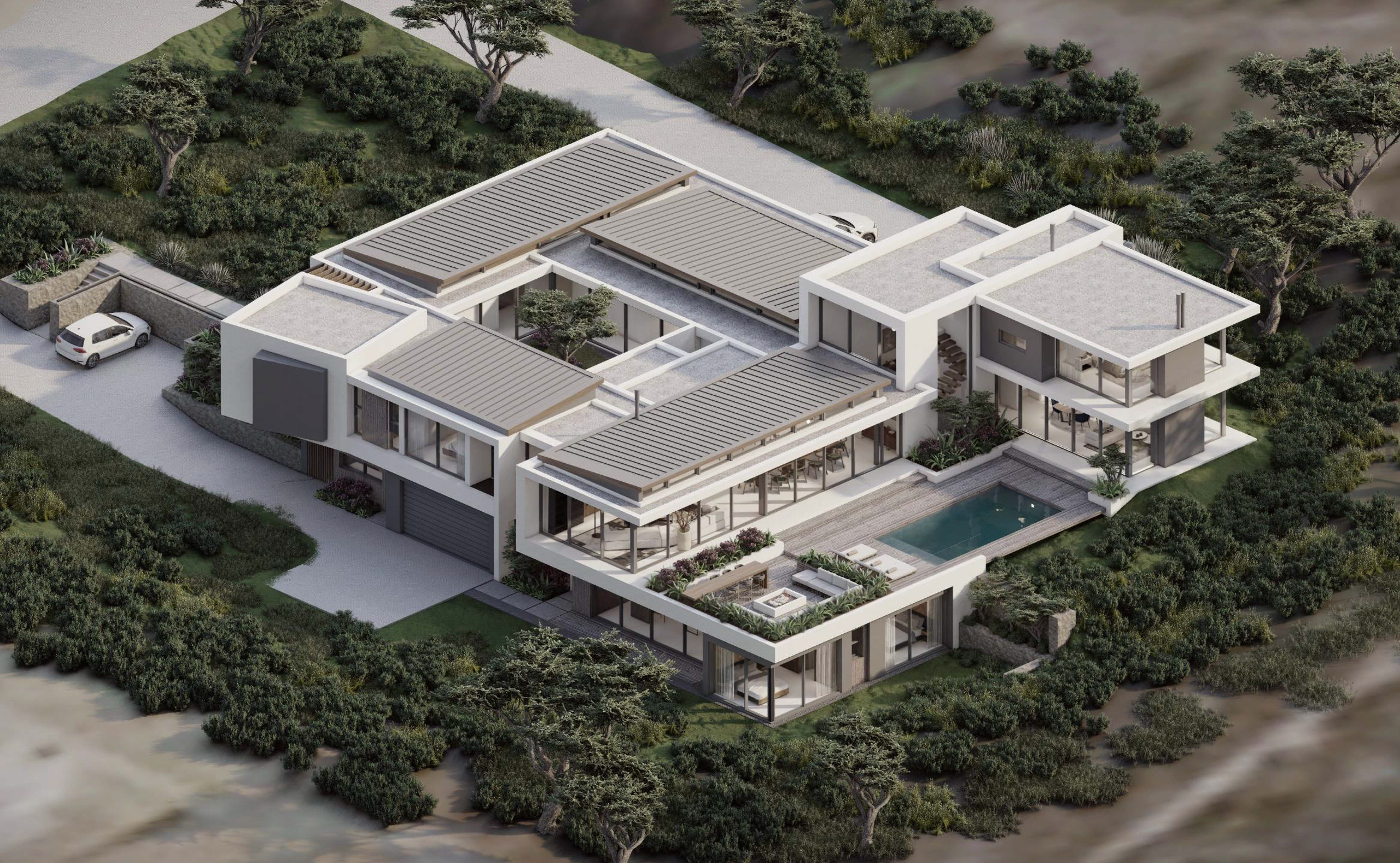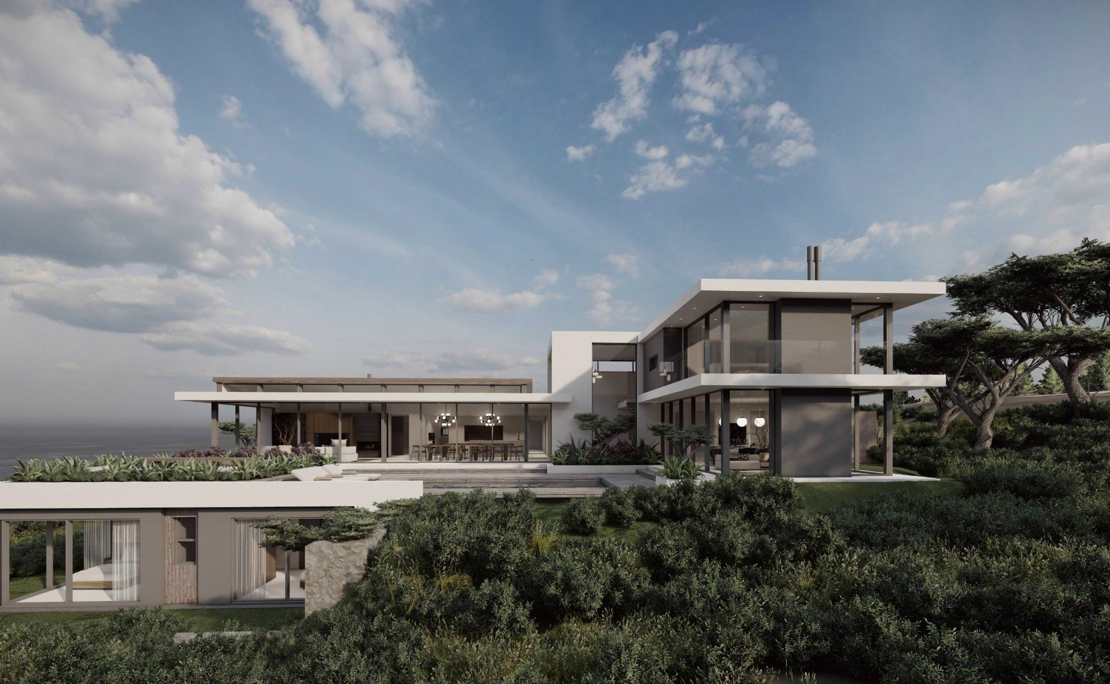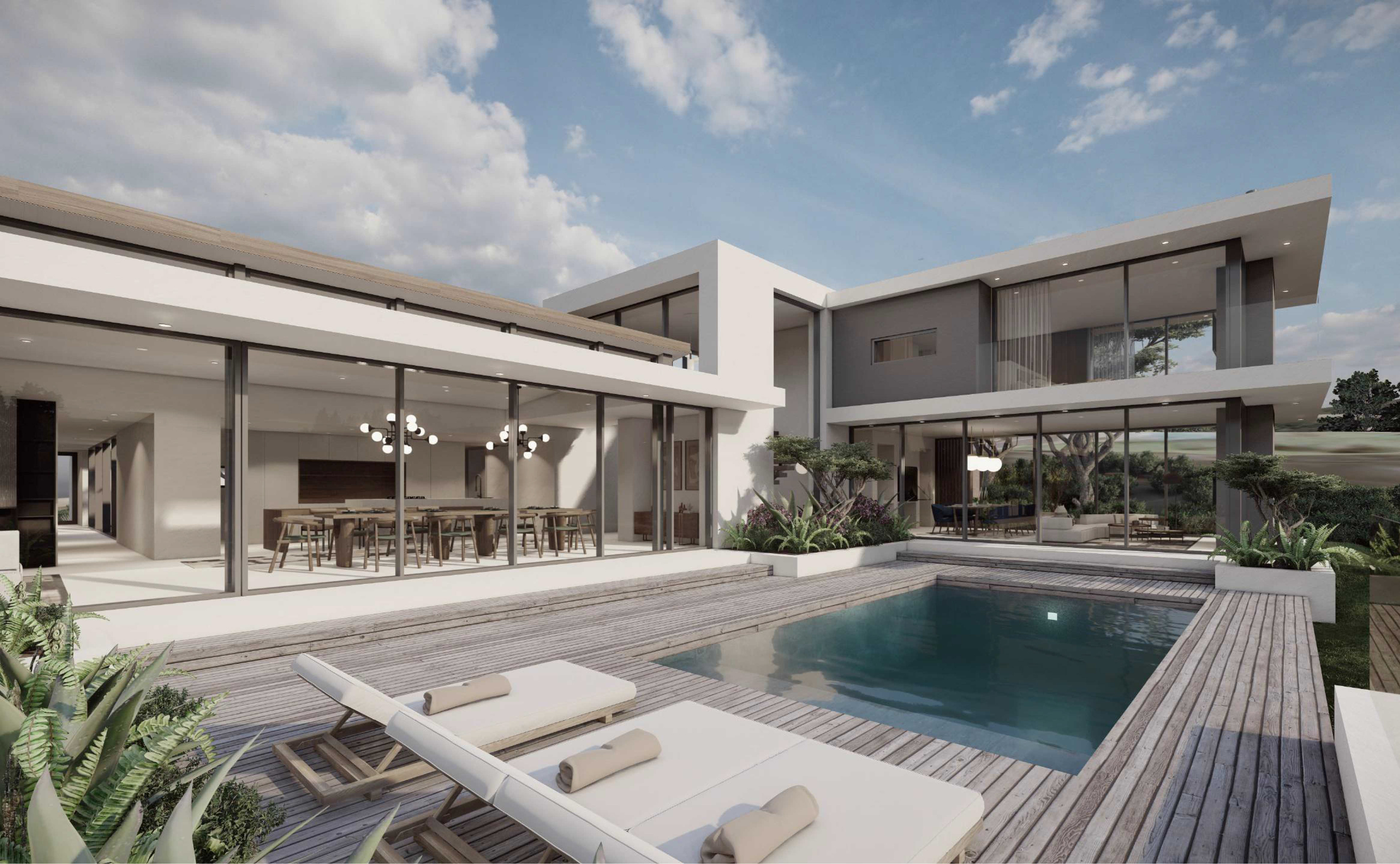 A contemporary addition to OUBAAI GOLF ESTATE in HEROLDS BAY, with modern geometric forms surrounding an internal courtyard.