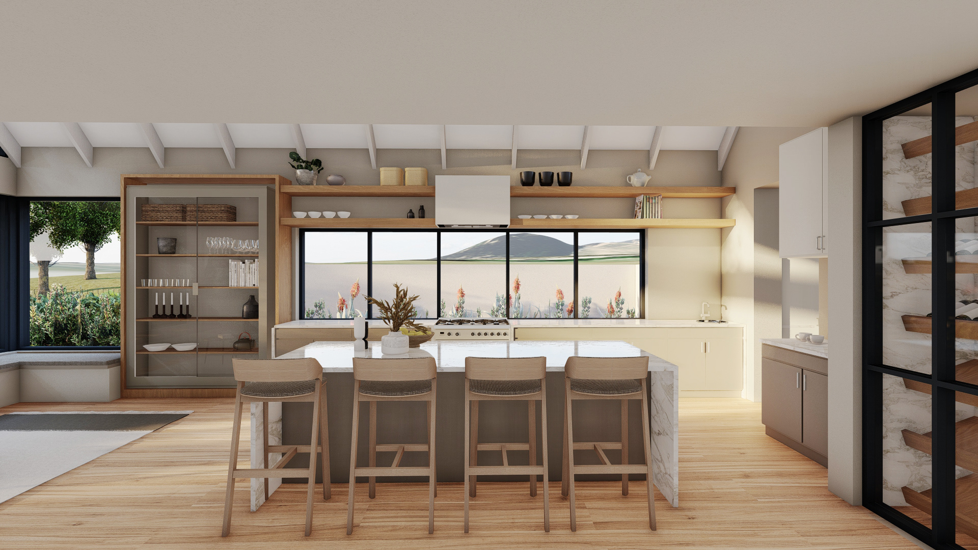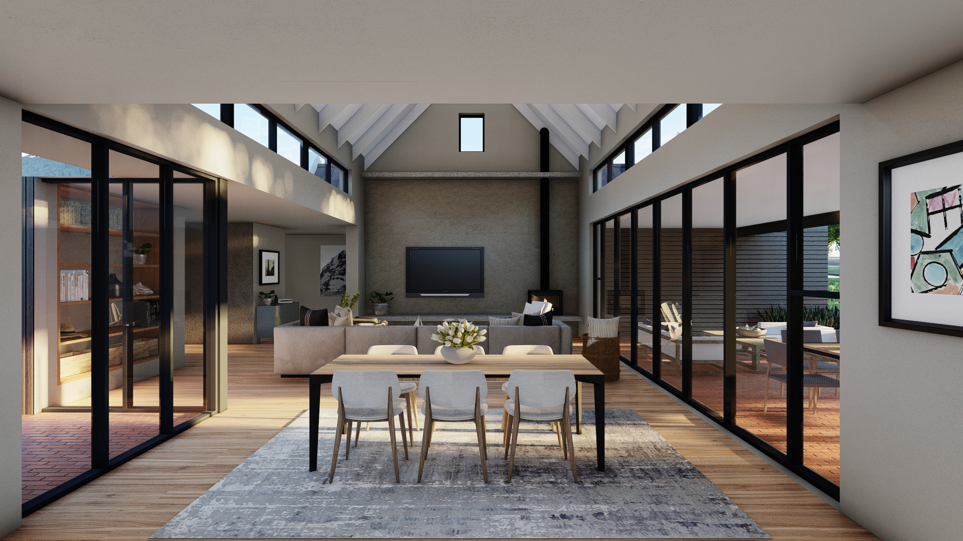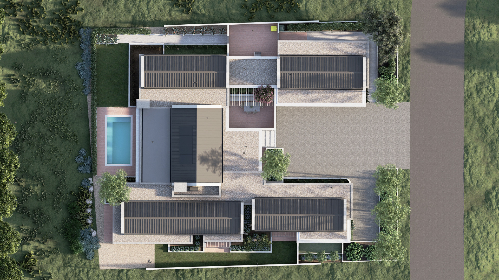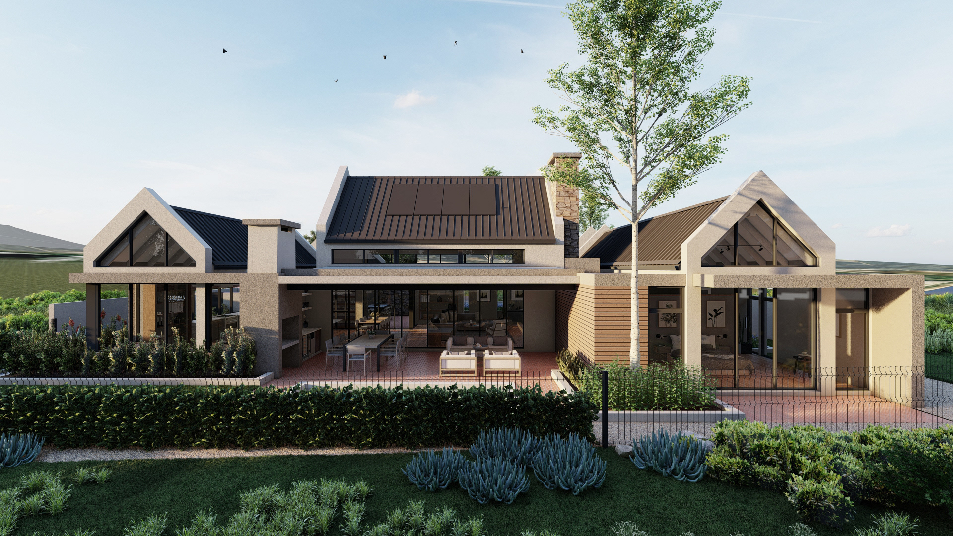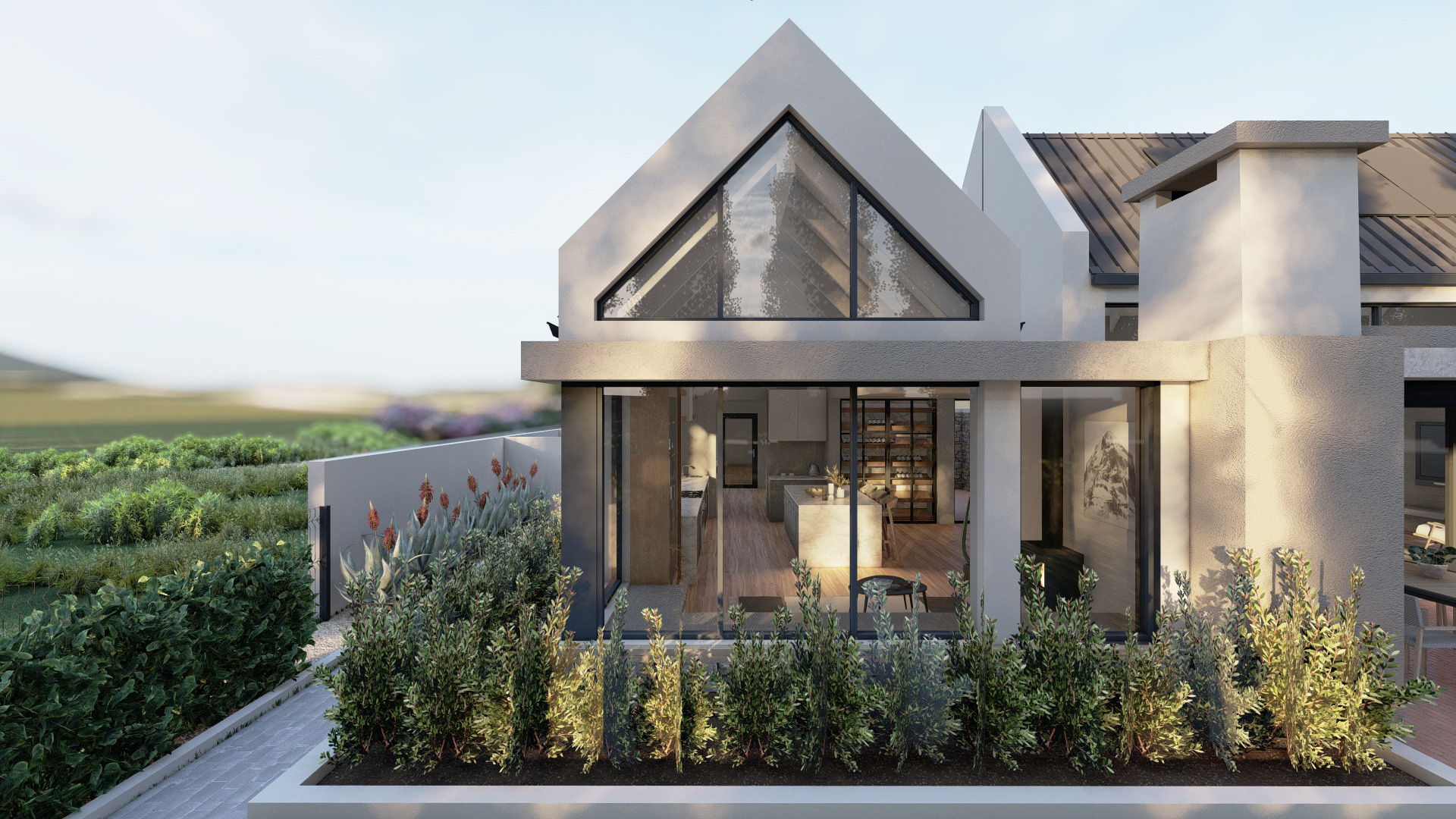 A contemporary Cape Vernacular-inspired single-storey home with crisp white gables, dark metal roofs, stone-clad accents and interconnected courtyards, elegantly set within the lush vineyard landscape of Vini Fera at Anura in Klapmuts.