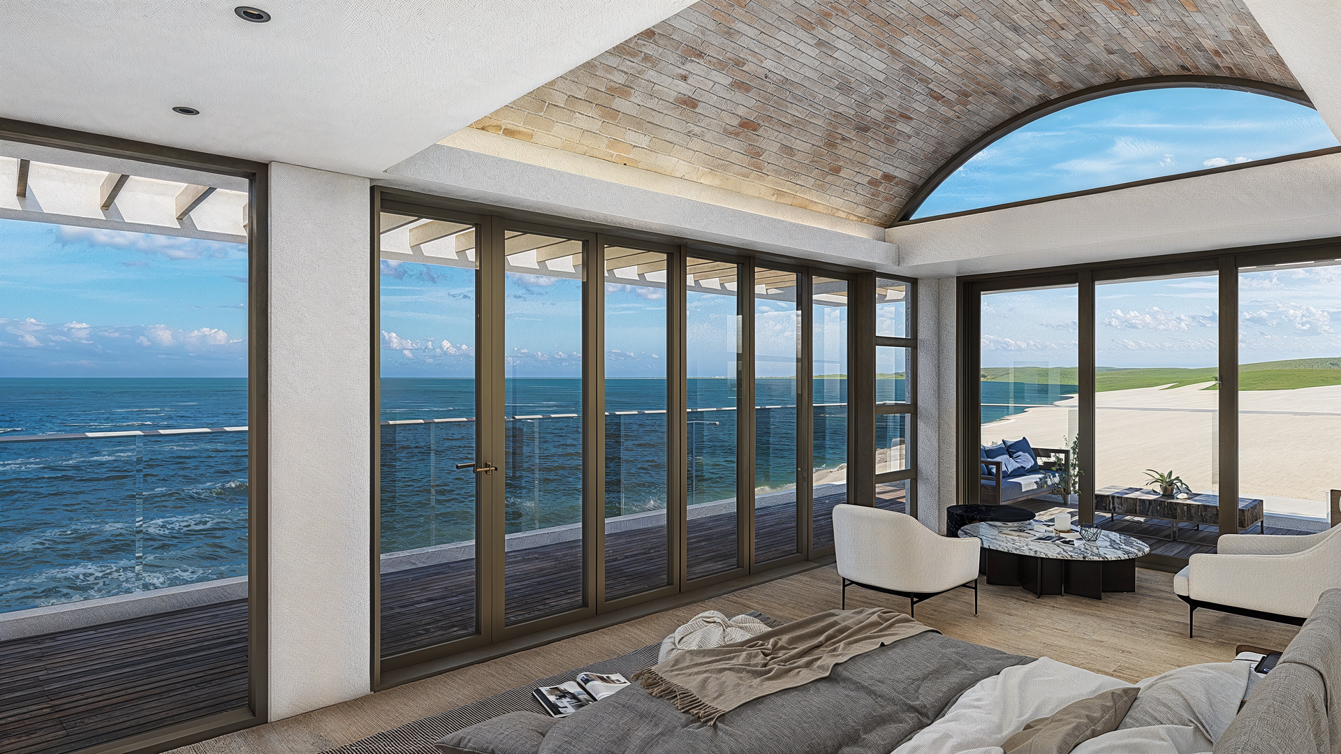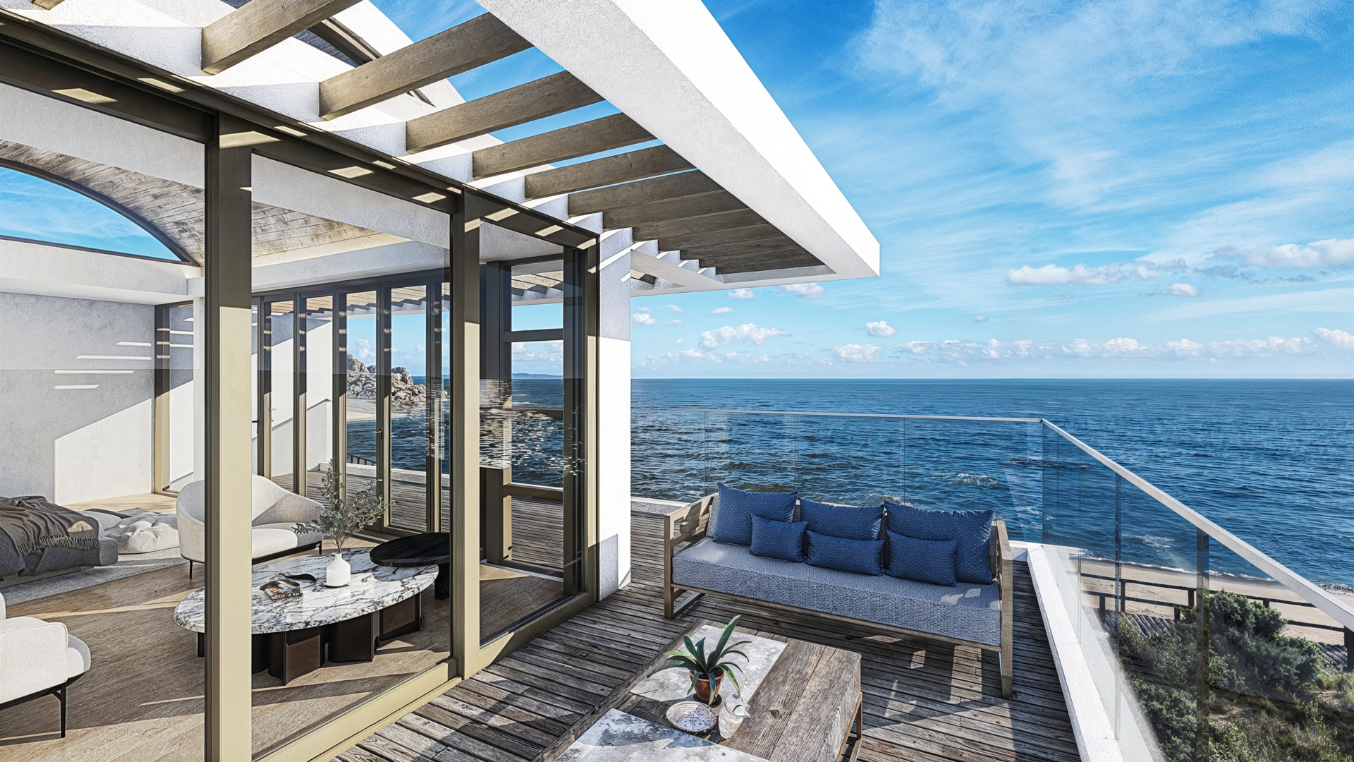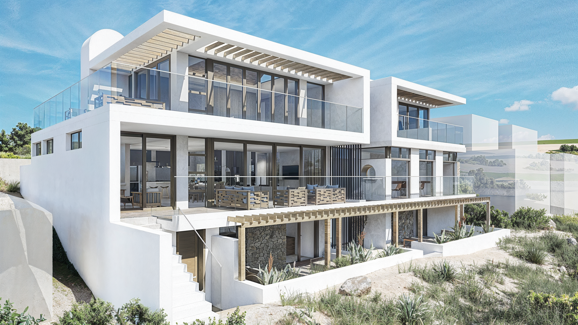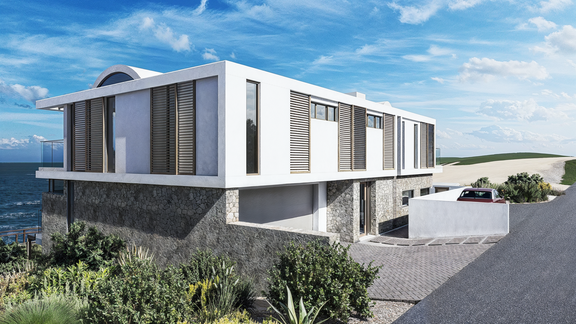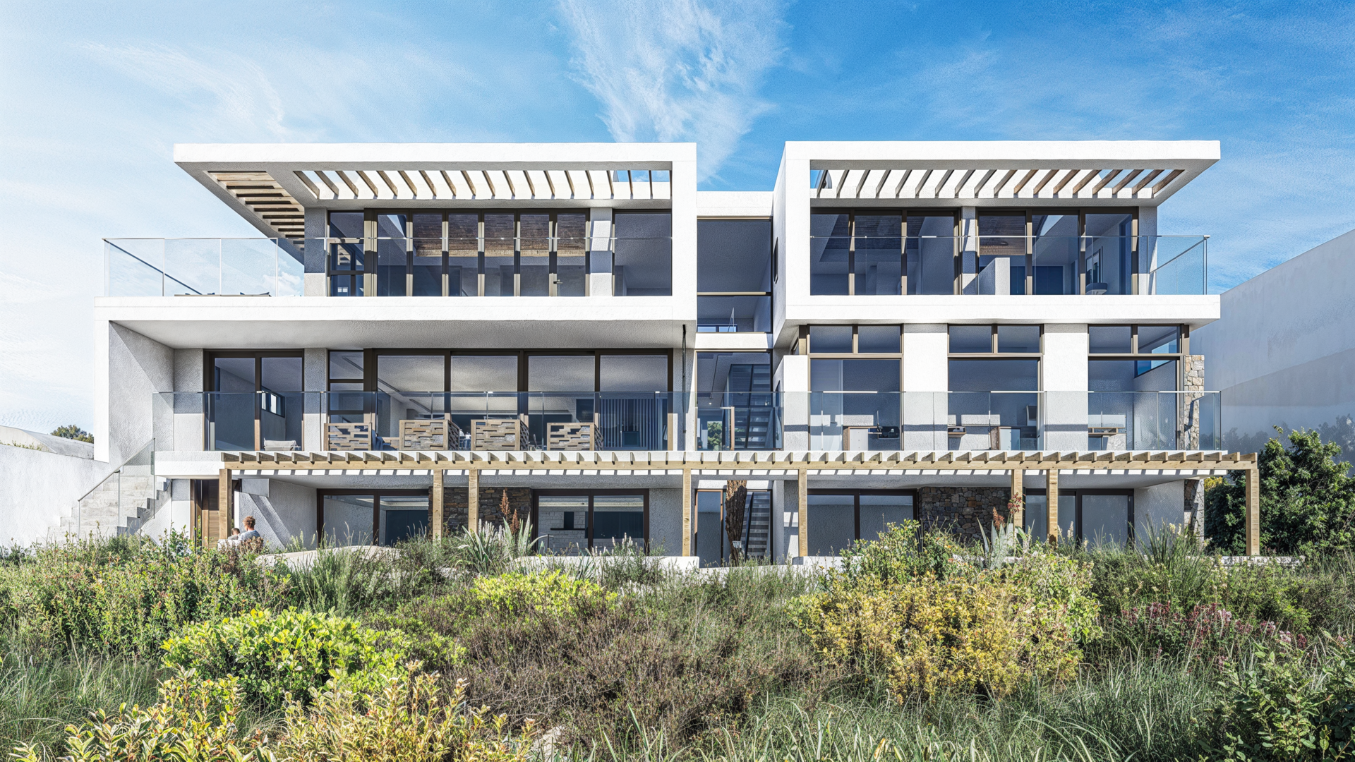 A dazzling, modernized Greek-inspired villa rises boldly from the wild dunes of Paradise Beach, Langebaan, its crisp white cubic forms, sweeping glass walls, and sun-dappled wooden pergolas cascading down the hillside like a contemporary Cycladic dream bathed in Mediterranean light.