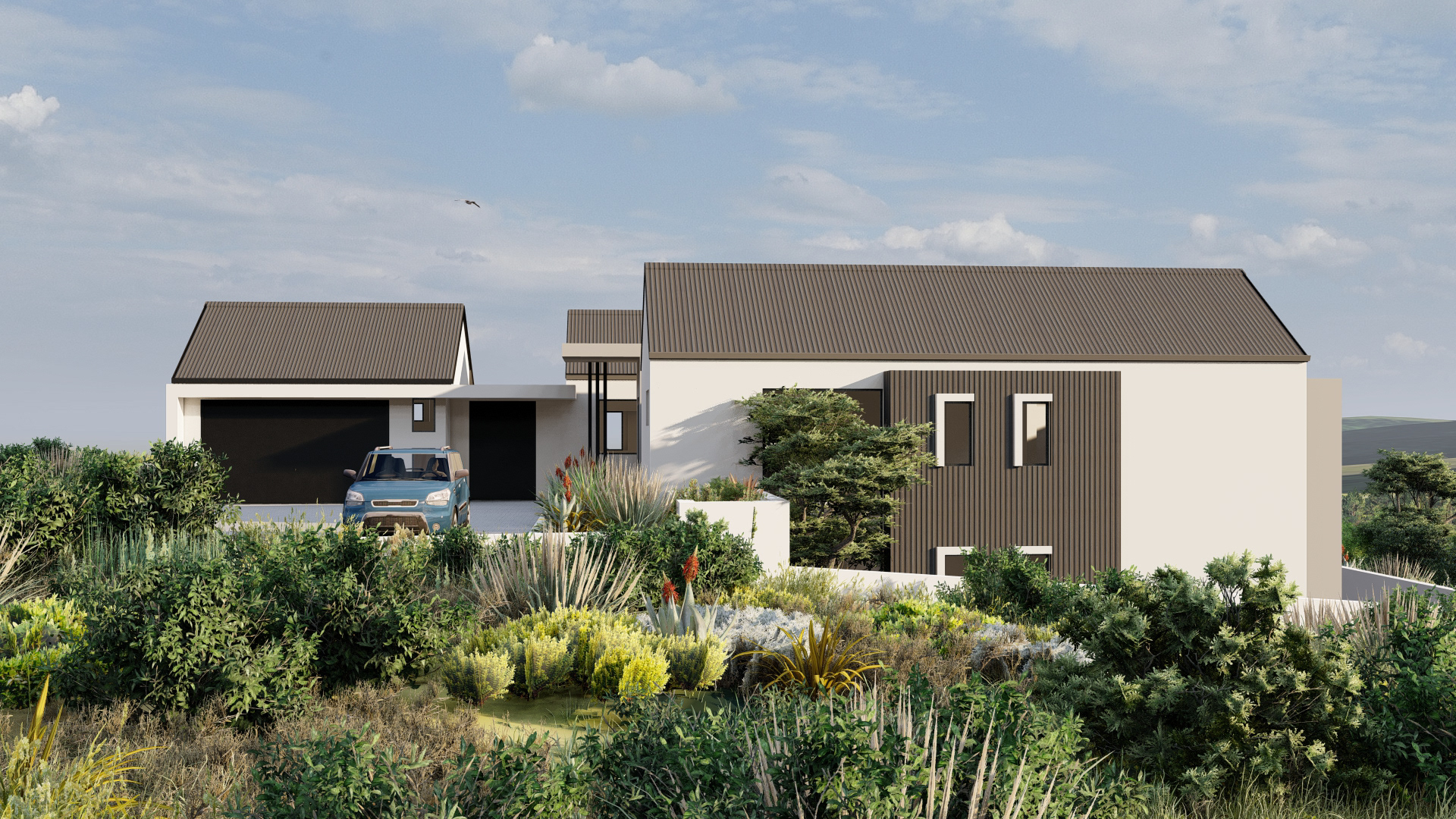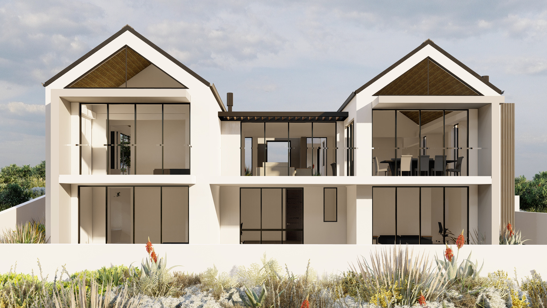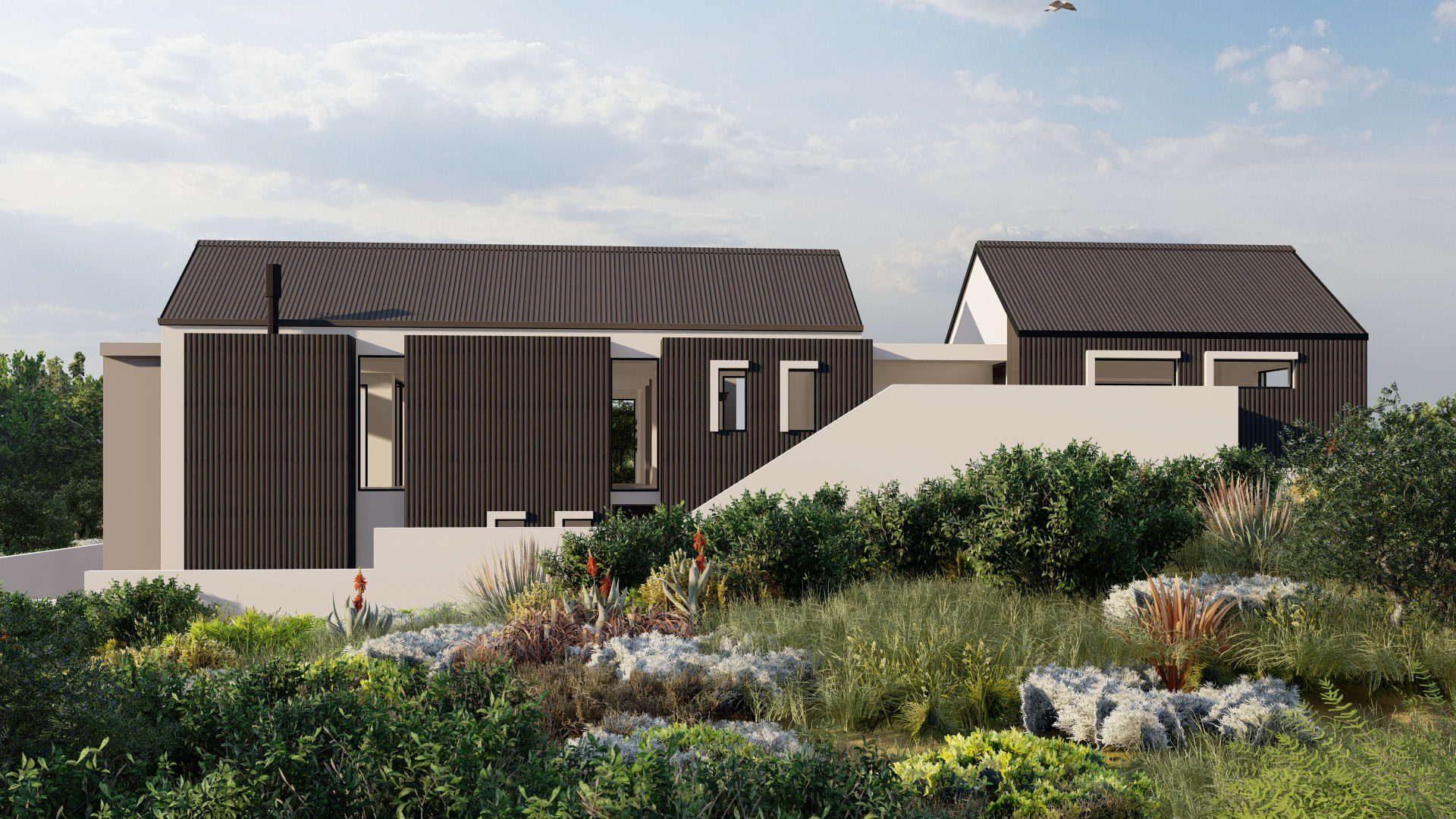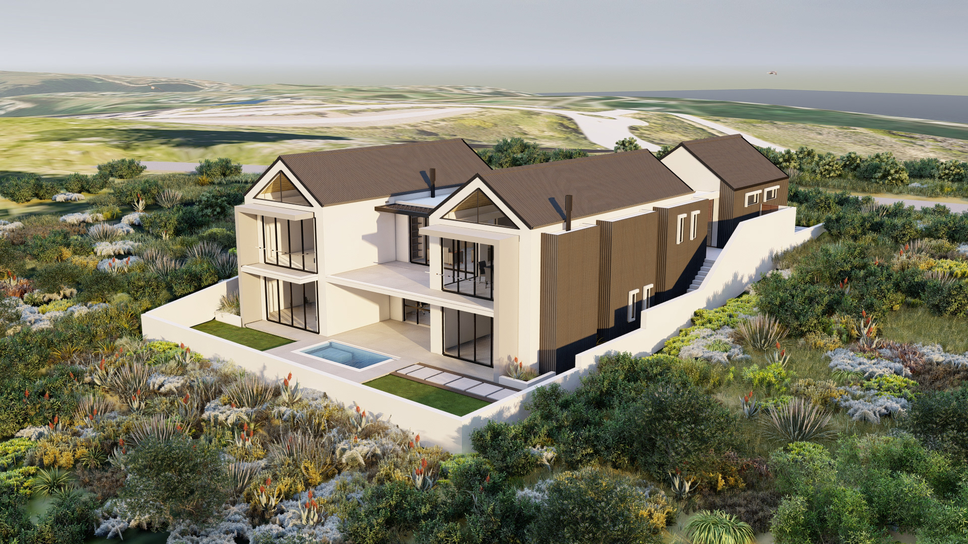 Perched at the forest’s edge, this modern farmhouse opens up to views of the majestic Outeniqua mountain range. The design embraces simplicity with its steel-clad exterior, creating a look of understated elegance.